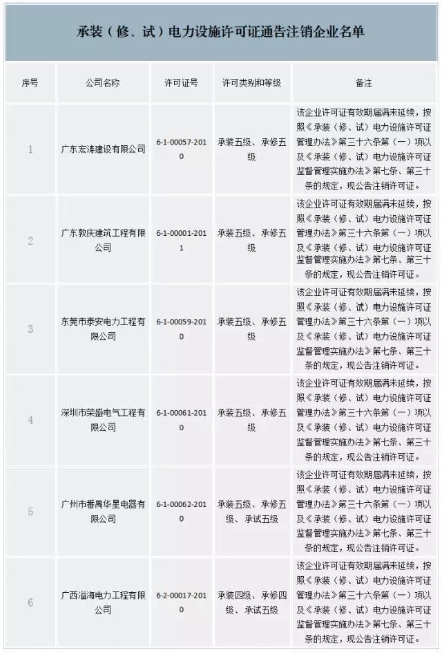 根據(jù)《承裝(修、試)電力設(shè)施許可證管理辦法》(電監(jiān)會(huì)令第28號(hào))第三十六條及《承裝(修、試)電力設(shè)施許可證監(jiān)督管理實(shí)施辦法》(電監(jiān)資質(zhì)〔2012〕24號(hào))第七條、第三十條的規(guī)定,廣東宏濤建設(shè)有限公司等6家企業(yè)(見附件)未按規(guī)定辦理許可證注銷手續(xù),現(xiàn)予以通告,通告期30日。通告期滿,我局將注銷其許可證。