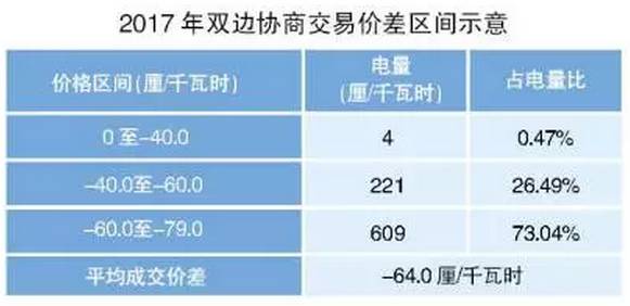 年度雙邊協(xié)商——相對于2016年年底月度競爭讓利-30.0~-40.0厘/千瓦時的價格信號,考慮廣東市場依然供大于求,2017年長協(xié)交易中,平均成交價差-64.0厘/千瓦時,反映出年度市場競爭較為充分。從成交結(jié)果來看,73%的交易電量集中在-60.0~-79.0厘/千瓦時之間,七成電量價格集中在平均價格附近,市場價格意愿集中。