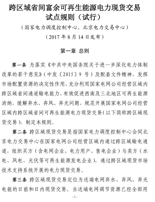 根據(jù)《國家能源局關于同意印發(fā)<跨區(qū)域省間富余可再生能源電力現(xiàn)貨試點規(guī)則(試行)>的復函》(國能函監(jiān)管〔2017〕46號)的相關要求,國家電力調(diào)度控制中心會同北京電力交易中心有限公司對試點規(guī)則進行了修改完善,現(xiàn)正式向市場主體發(fā)布。