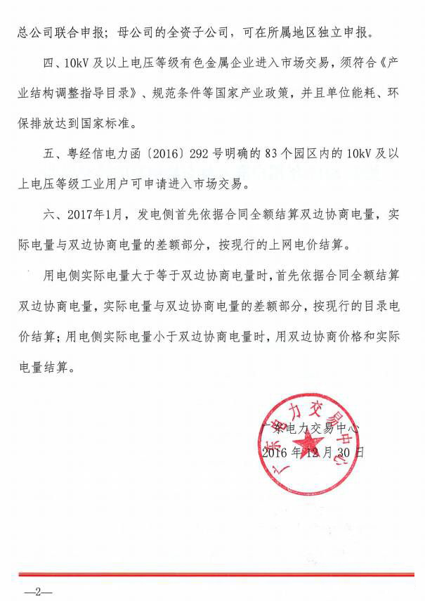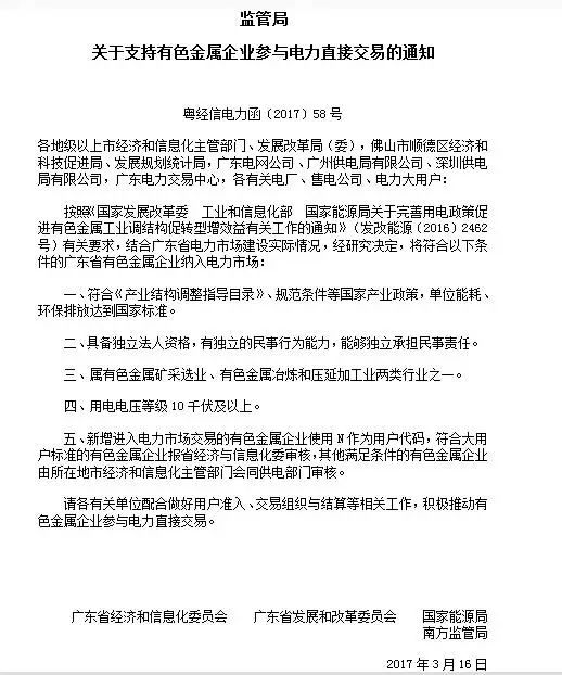 隨后,廣東省發(fā)布《關于2017年用戶準入及交易結算的補充說明》,將部分大型骨干企業(yè)、有色金屬企業(yè)等納入電力市場: